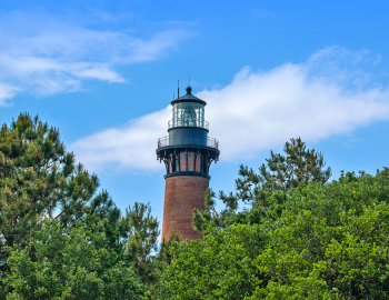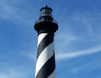 This iconic NC lighthouse is easily recognized by its vibrant black and white striped façade that stands out starkly against blue waters.